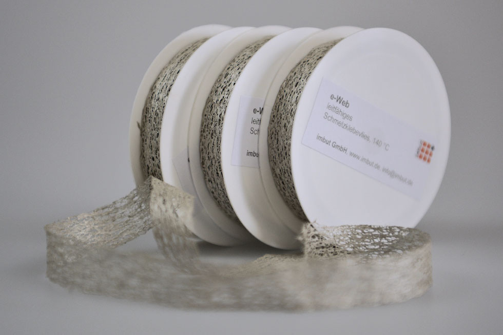 Das e-Web ist ein elektrisch leitfähiges Klebevlies und stellt eine flächige elektrische Verbindung her. Damit können Anwender leitfähige Textilstrukturen untereinander, aber auch mit leitfähigen Folien, elektronischen Bauelementen und Anschlusskabeln auf textilen Leiterbahnen verbinden. Außerdem ermöglicht die flächige Kontaktierung beispielsweise die elektrische Verbindung textiler Heizstrukturen und somit ein gleichmäßiges Erhitzen eines Heiztextils.