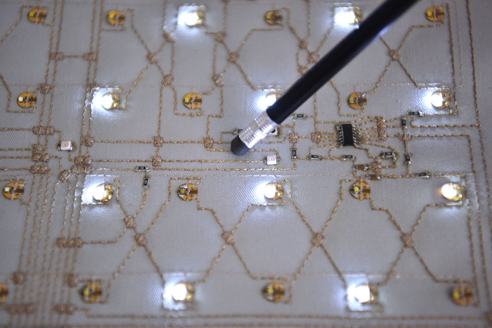 - Materialbasis sind leitfähige Fäden und Drahtlitzen in Kombination mit textilen Garnen